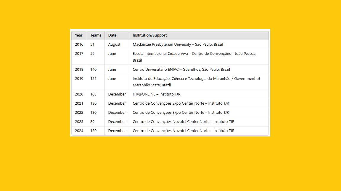 The journey of the ITR – International Tournament of Robots began in 2015, when Professor César Augusto Rangel Bastos coordinated the first national final of the TJR – Torneio Juvenil de Robótica (Youth Robotics Tournament). The event took place at Colégio Santo Inácio in Rio de Janeiro, Brazil. That same year, the TJR became a gateway for Brazilian teams to qualify for the ITR, marking its first official collaboration with the international tournament. The inaugural ITR was held on August 27, 2016, at the Mackenzie Presbyterian University in São Paulo.